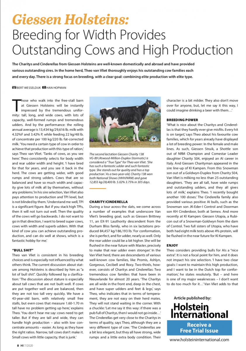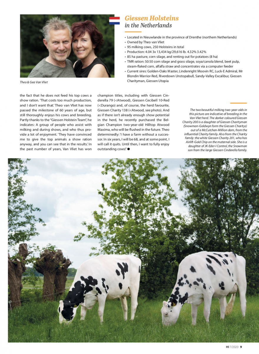 In the June 2020 issue of the montly breeders magazine Holstein International is a super interesting article written about the famous herd of Theo van Vliet: Giessen Holsteins. Top management and breeding are resulting in one of the Netherland's greatest Holstein herds. The milk average at Giessen Holsteins is 13.400kgM / cow and the 2-Yr Olds are classified with >VG-87. Two cow families that did a great job at Giessen Holsteins are the Charity's and Cinderella's. Currently one of the best 2-Yr Olds is Giessen Charity 201 a JK-Eder Control dtr and a Airlift x Gold Chip. These 2-Yr Old represent the breeding philosophy of Giessen Holsteins. Click further to read the full article.