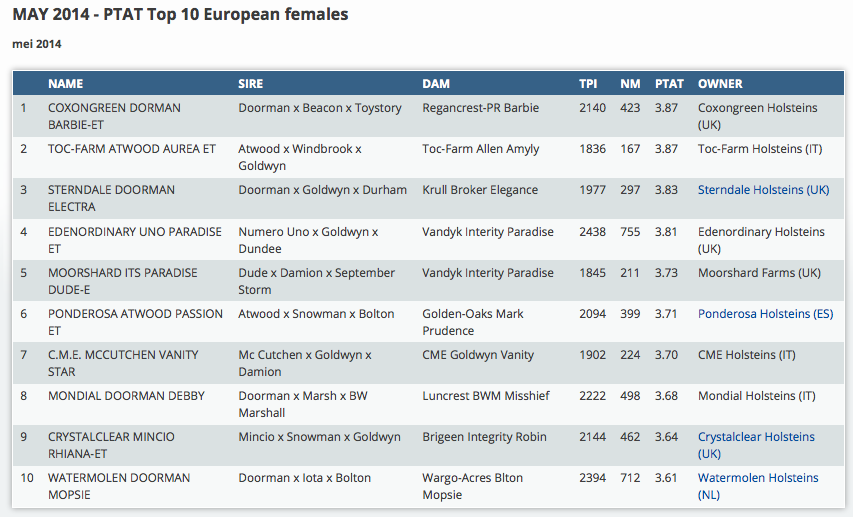 Click further for the top GTPI, Net Merit & PTAT rankings of European tested females tested in May 2014!