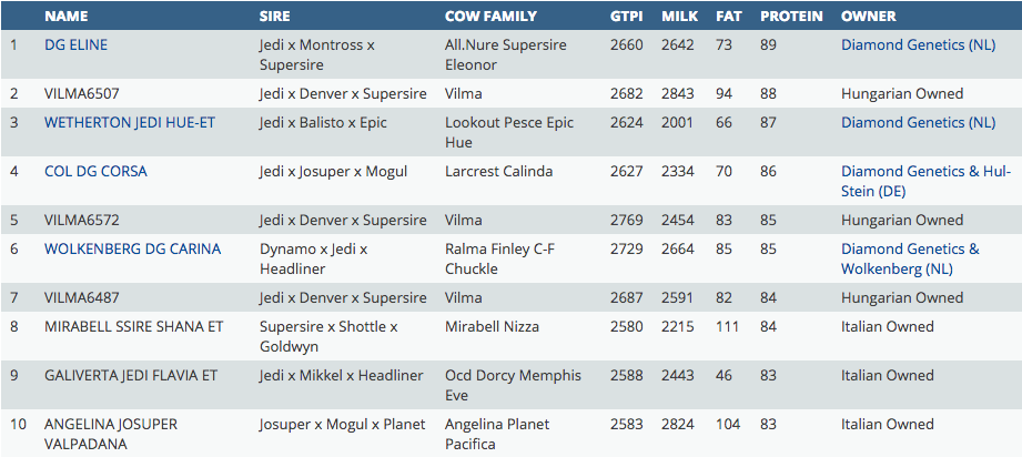 The TOP 10 PROTEIN females in Europe are available. Topping the list is DG Eline a Jedi daughter with +89 protein and +2660 gTPI from the family of the popular bulls ELDORADO & ELLIOT. She is goes back on a Montross and VG-88 Supersire to Savage-Leigh Skychief Louise EX-94-USA. Dominating the list is JEDI, no less than 7 females are in the top 10 PROTEIN females! Unique! The #3 in the list is bred by Wetherton Holsteins: Wetherton Jedi Hue again a Jedi daughter from the Cookiecutter Shthollerwood EX-92-USA DOM family and currently owned by Diamond Genetics & Hul-Stein.