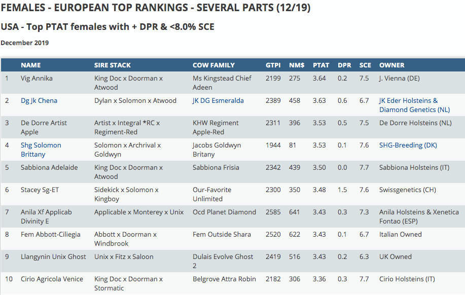 A different ranking based on GTPI with the top ranking PTAT females in Europe with at least a positive DPR (Daughter Pregnancy Rate) and <8.0% SCE (Sire Calving Ease). Topping at +3.64 PTAT is ViG Annika a King Doc heifer from the Ms Kingstead Chief Adeen family. Second in the top three is JK Eder DG Chena a Dylan x Solomon x Atwood from the French Carf Emeraude EX-91-NL. Her third dam JK DG Esmeralda EX-92-NL EX-94-MS was sixth in her section at the European Show in Libramont last year. At the third spot we find SHG Solomon Brittany from SHG-Breeding with a rare combination of +3.53 PTAT, 7.6% SCE and +0.1 DPR. She is a great Solomon grand daughter of the extraordinary Jacobs Goldwyn Britany EX-96-CAN EX-96-MS 2E 15*. Furthermore in a shared third place we find De Dorre Artist Apple at 3.53 PTAT. She is an Artist x Integral *RC x the 'one million dollar cow' KHW Regiment Apple-Red-ET EX-96-USA 28* 4E DOM who recently passed away.