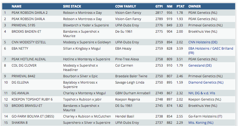 The highest GTPI heifer in Europe in the September '17 run is a Robson daughter with GTPI +2817. More then 5 heifers from the Top 40 GTPI of September '17 are selling in the German Masters Sale, under which CNN Estell (GTPI +2759) from the UFM-Dubs Eroy cow family. Also the September run brings a new #1 GTPI Polled heifer in Europe: Col DG Cookie *P of Genesland, a Polled Bandares daughter with over 2700 GTPI!! Click further for the complete Top 40 GTPI of the European females.