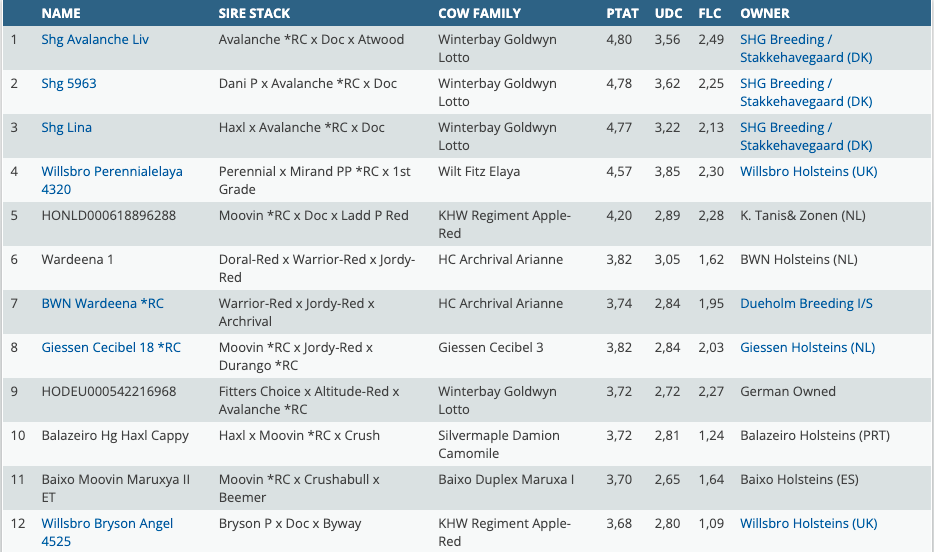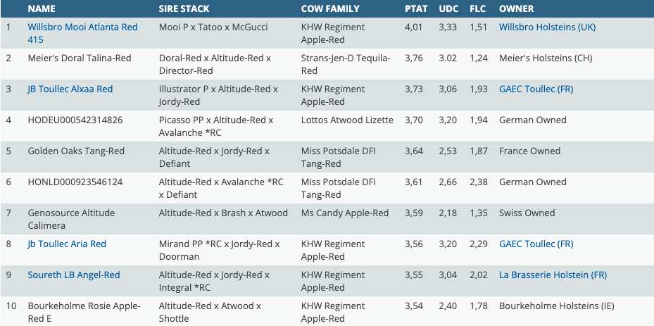 A new index round brings us also new chart toppers in the R&W and RED CARRIER GTPI and PTAT rankings. Today it's time for these great rankings op the dominating females in Europe. The influence of the APPLE's is again huge with delivering several offspring at the partenal sires and maternal line. The #1 R&W PTAT female is this April 2023 run Willsbro Mooi Atlanta Red 415 at +4.01 PTAT. She is a Mooi daughter out of Panda Tactik Atlanta VG-87-UK VG-88-MS 2yr. (s. Tatoo) and tracing back to KHW Regiment Apple-Red EX-96-USA. She is followed by Meier's Doral Talina-Red at the 2nd spot at +3.76 PTAT. Making the Top 3 complete with JB toullec Alxaa Red at +3.73 PTAT and +3.06 UDC! She is owned by Gaec Toullec and sired by Illustrator P out of JB Toullec Alexa-Red VG-87-FR 2yr. Stakkehavegaard / SHG Breeding delivers the #1 *RC female in Europe with again SHG Avalanche Liv *RC at +4.80 PTAT. She is followed by her daughters at the 2nd spot and 3rd spot: SHG 5963 (s. Dani P) at +4.78 PTAT and SHG Lina (s. Haxl) at +4.77 PTAT!