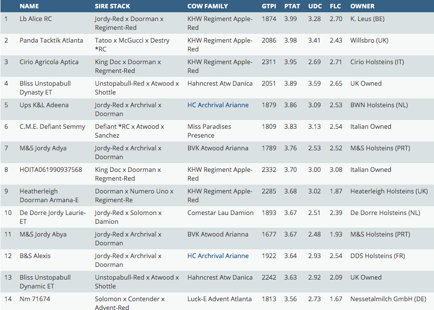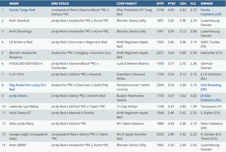 Today it's time for the latest top rankings based on PTAT of the RED CARRIERS and R&W females in Europe. Dominating in the list is one of the most influential brood cows for the R&W breed who recently passed away: KHW Regiment Apple-Red EX-96-USA 28* 4E DOM. She delivers no less than 15 offsprings in both top 25 rankings! An amazing performance!! The #1 PTAT R&W in Europe is this run the stunning Unstopabull-Red daughter: Panga Tango Red at +4.00 PTAT, she is a grand daughter of the famous North-American R&W show cow: Miss Pottsdale DFI Tang-Red EX-94-USA. The influence of Jordy-Red is gigantic with delivering 26 daughters in the top R&W and RED CARRIER PTAT females. The #1 *RC PTAT female is this run LB Alice *RC at +3.99 PTAT, an APPLE-RED grand daughter bred by La Brasserie Holstein (FR) and sold by Hullcrest Holsteins (NL) in the German Masters Sale 2019 to Belgium.