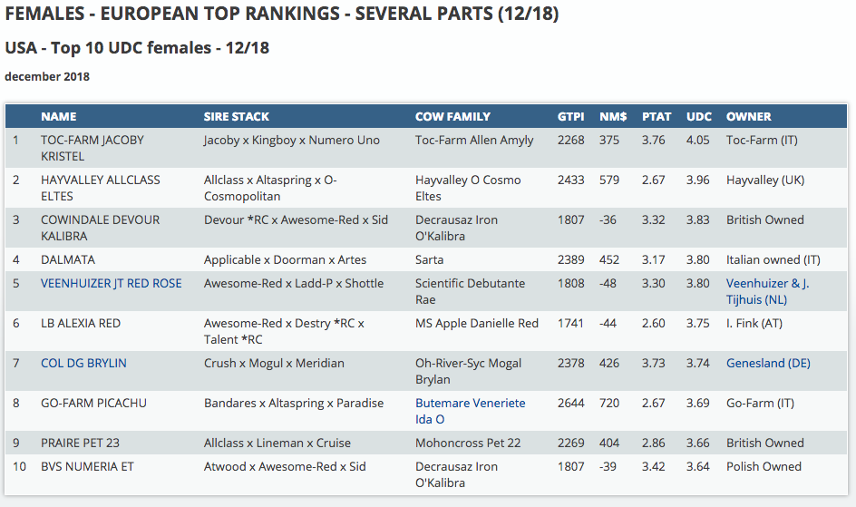 In Europe they are some of the highest UDC (Udder composite) females in the breed based on GTPI. Topping the list is Toc-Farm Jacoby Kristel a Jacoby daughter with +4.05 UDC and from the family of Toc-Farm Allen Amyly. Notable is the only R&W heifer in the list: Veenhuizer JT Red Rose she is an Awesome-Red daughter with +3.80 for her UDC!! The #7 in the list is the full sister to Col DG Crushtime @ ST: Col DG Brylan, she notes +3.74 UDC. Also the Veneriete Ida family is in this top list with Go-Farm Picachu, she from the same family as the popular daughter proven sire BOARD @ RUW.