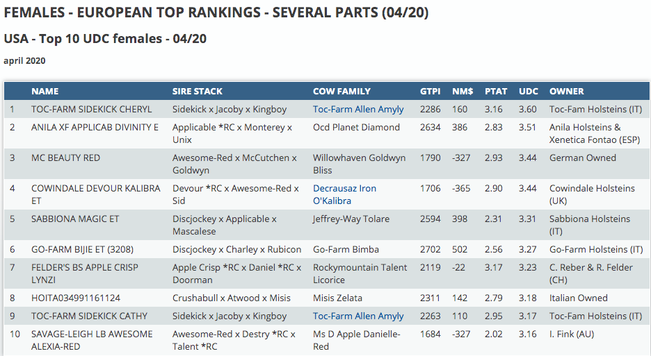The exciting list about the top ranking UDDER females based on the trait UDC of the American GTPI index is now available! n relation to the December 2019 proof there are some little changes comparing it to the top 3. The new #1 UDC female is the foregin #4 UDC female: Toc-Farm Sidekick Cheryl at 3.60 UDC. She traces back to the great transmitter & show cow: Toc-Farm Allen Amyly EX-96-IT. This family also brought Bel Doorman Zita VG-87-DE 2yr. - Junior Champion Swiss Expo 2017. Furthermore we find Cowindale Devour Kalibra at the fourth spot with +3.44 for udders. She is a daughter of Panda Awesome O'Kalibra VG-86-UK 2yr. and traces back to the legendary European Champion Decrausaz Iron O'Kalibra EX-97-CH. Close family to Wilcor Goldwin O'Kadabra VG-89-NL EX-92-MS 4yr. - HM. 2-Yr Old Champion HHH-Show '16 @ van Wijhe. Making the top 10 complete is Savage-Leigh LB Awesome Alexia-Red an Awesome-Red daughter from one of Apple's latest EX-95 descendants: Ms D Apple Danielle-Red EX-95-USA, bred by La Brasserie Holstein and sold for 9.200 EUR in the La Brasserie Sale '18 to Austria.
