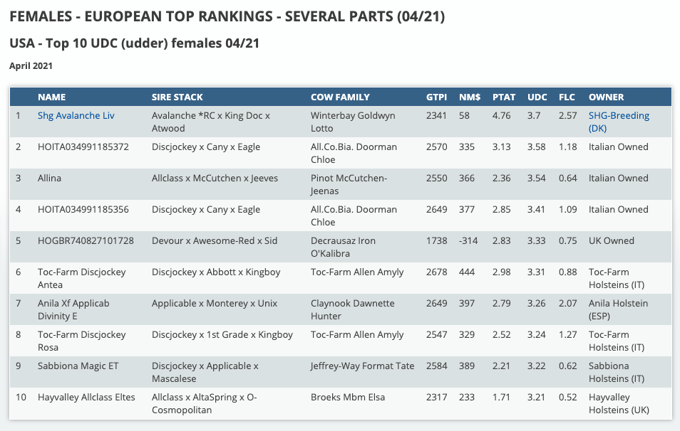 The intriguing list about the top ranking UDDER females based on the trait UDC of the American GTPI index is now available! In relation to the former proofs there are some little changes comparing it to the top 3. Again the #1 UDC female is the #1 PTAT female in the WORLD: SHG Avalanche Liv *RC at +3.70 UDC. She traces back to the great brood- & show cow: Winterbay Goldwyn Lotto EX-95-CAN. At the second spot we find an Italian Discjockey daughter at +3.58 UDC. In third we find an Allclass daughter from a McCutchen dam at +3.54 UDC, either from Italy. At the 6th spot, we find another Discjockey daughter: Toc-Farm Discjockey Antea at +3.31 UDC. She traces back to the great transmitter & show cow: Toc-Farm Allen Amyly EX-96-IT. This family also brought Bel Doorman Zita VG-89-DE EX-MS La2. - Junior Champion Swiss Expo 2017.