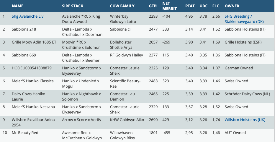 The list about the top ranking UDDER females based on the trait UDC of the American GTPI index is now available! In relation to the former proofs there are soms little changes in the list. The #1 UDC female is again the #1 PTAT female in the WORLD: SHG Avalanche Liv *RC at +3.78 UDC. She is a Avalanche *RC daughter and traces back to the great brood- & show cow: Winterbay Goldwyn Lotto EX-95-CAN. The #2 in this ranking is an Italian Delta-Lambda daughter at +3.41 UDC. On the third spot we find an Moovin *RC daughter out of the amazing brood cow Bolleholster Shottle Anya. At the 9th spot we find Willsbro Adina 2954 . She is a Arrow daughter at +3.26 UDC and backed by the KHW Goldwyn Aiko EX-91-USA family.