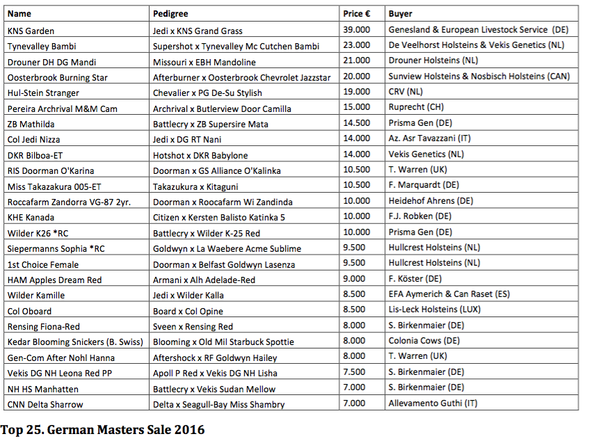 Topseller in the German Masters Sale was KNS Garden, consigned by KNS Holsteins, a Jedi daughter with GTPI +2782 out of Mardi Gras x Iota from the KNS Grand Prix cow family. Garden sold for € 39.000 to Genesland and European Livestock Service from Germany.