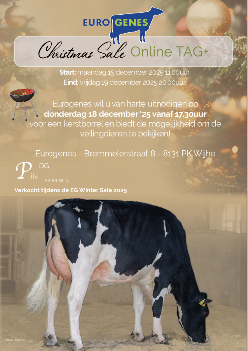 Eurogenes wil u van harte uitnodigen op donderdag 18 december ‘25 vanaf 17.30uur om de veilingdieren te bekijken en onder het genot van een hapje en een drankje het jaar af te sluiten!
