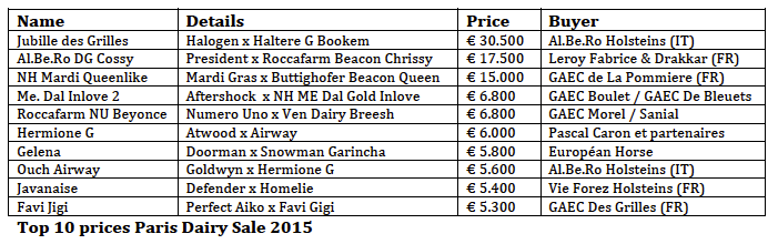 The 2nd edition of the Paris Dairy Sale held on Tuesday, February the 24th during the SIMAGENA in Paris. It has been a very successful edition with an average price of € 5.074 to buyers out of several different countries. Lot 42, Jubile des Grilles was the topseller for € 30.500 and goes to Al.Be.Ro Holsteins from Italy.