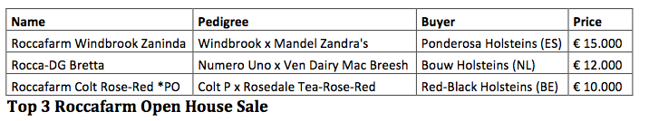 The 1st edition of the Roccafarm Open House Sale have been very successful. 31 out of the 35 sale animals sold through the TAG+ sale system for an average price of € 6.144 / animal to buyers out of 6 different countries. Roccafarm Windbrook Zaninda topped the sale for € 15.000. This beautiful heifer won the Jr. Championship at the Int. Show in Libramont last Saturday and sold to Ponderosa Holsteins in Spain.