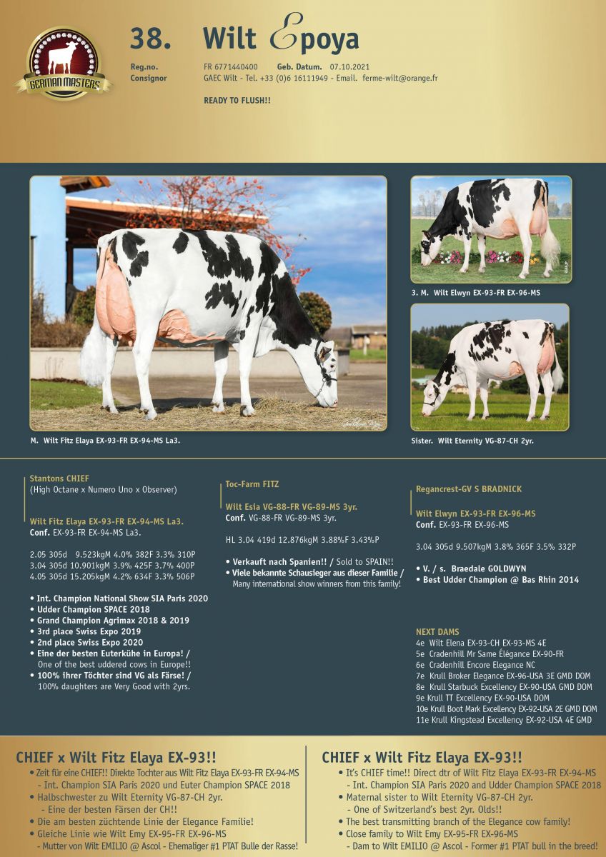 Wilt Epoya is a stunning Chief daughter straight out of the Intermediate Champion SIA Paris 2020 and Udder Champion SPACE 2018: Wilt Fitz Elaya EX-93-FR EX-94-MS La3 and sells tomorrow in the German Masters Sale 2022 as Lot 38!! She is from the best transmitting branch of the Elegance EX-96-USA cow family! Wilt Epoya is maternal sister to one of Switzerland's best 2yr. olds: Wilt Eternity VG-87-CH 2yr. Grand dam to Wilt Epoya and Wilt Eternity VG-87-CH 2yr. is Wilt Esia VG-88-FR VG-89-MS 3yr. she is sired by Bradnick and out of Wilt Elwyn EX-93-FR EX-96-MS. This amazing family is close family to one of the best French Wilt Emy EX-95-FR EX-96-MS, she is dam to the former #1 PTAT sire: Wilt Emilio @Ascol. Wilt Epoya sells tomorrow in absentee!