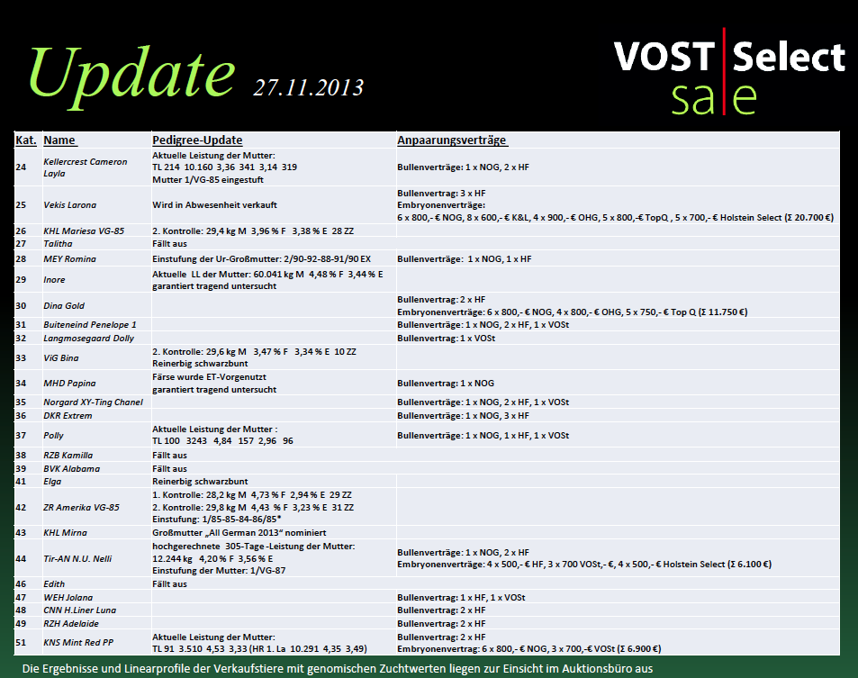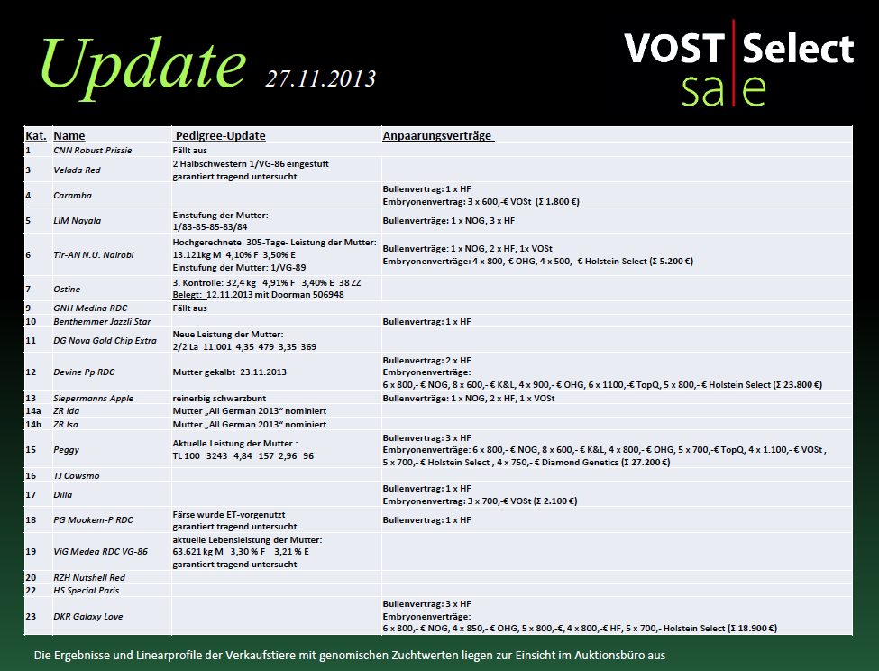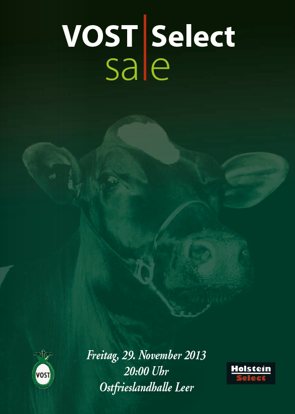Tomorrow, on Friday November the 29th will be the very first VOST | SELECT sale, which will held in the Ostfrieslandhalle in Leer (Germany). The sale is organized by the German AI station VOST and by Holstein Select. 51 lots are selling, including top ranking heifers in the German RZG and the American GTPI rankings, and great show type cows, all from the best cow families. Click further for the Online Catalogue, sale / contract update or more information.