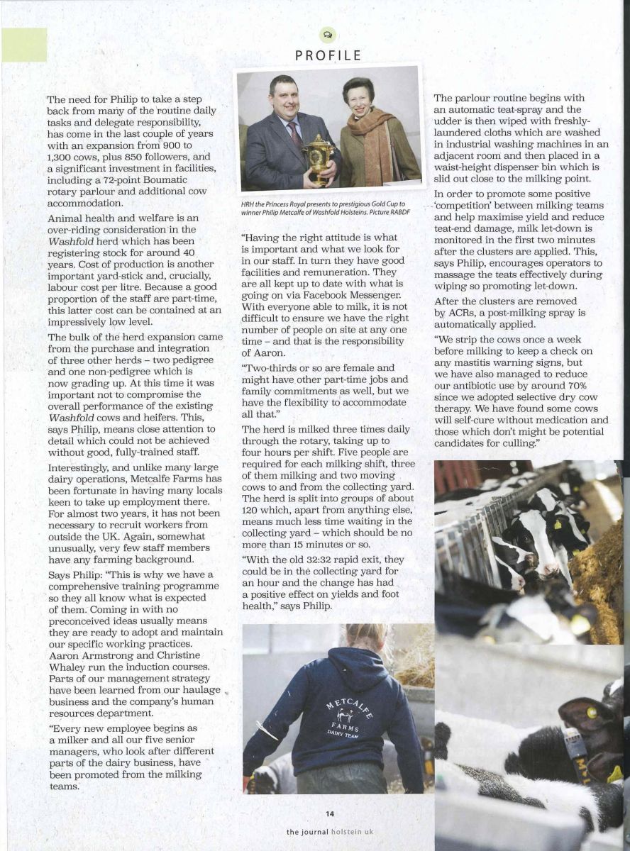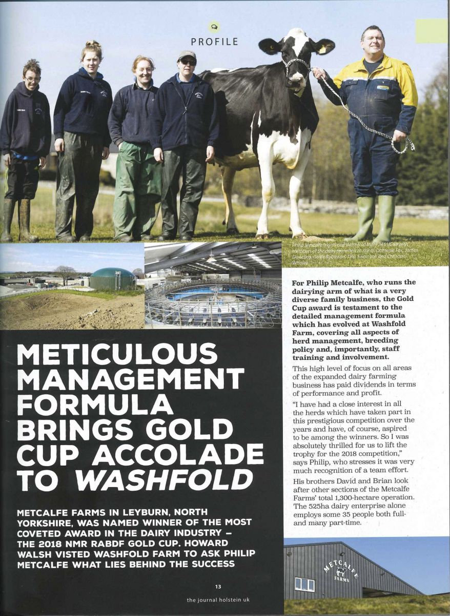 In the Journal magazine of Holstein UK we find an interesting article written about Washfold Holsteins. Their farm Metcalfe Farms maintains 1.300 dairy cows with a dairy herd average of 11.800kgM with 3.9% Fat and 3.3% Protein. This incredible herd has 70 EXCELLENT cows, 380 VG and 4 100.000kgM cows. At Washfold Holsteins they work with the best cow families around the globe and top index cows. You can find a RED CARRIER family member to Riverdane Ashlyns Gold EX-93-UK (winner Senior Class 7 European Show 2019) and top 25 GPLI heifer at Washfold Holsteins.