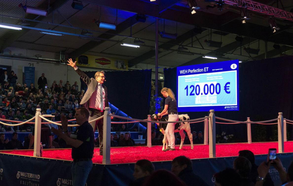 The Gymnast daughter WEH Perfection, bred by the Hintze family (WEH Holsteins) was the topseller of the Masterrind Exclusive Sale for € 120.000, Perfection is the highest Gymnast daughter in the world with GTPI +2863, which she combines with a very high RZG, gPFT & more indexes. Her dam is DG Pandora, which sold through the Eurogenes Sale (European Classic Sale), DG Pandora is the full sister of the popular, high RZG sires Ibsen @ Vost and Mr. Puma @ AI Total. 3rd highest price (€ 21.000) was paid for Xanthippe, bred by Ludger Eiting, a GTPI >2800 Modesty daughter from a Doorsopen, Xanthippe's dam was sold through the Eurogenes Sale (European Classic Sale) as well. EUR 20.000 was paid for NH Sunview Hearthlove, a GTPI +2786 / RZG 160 Bandares daughter.