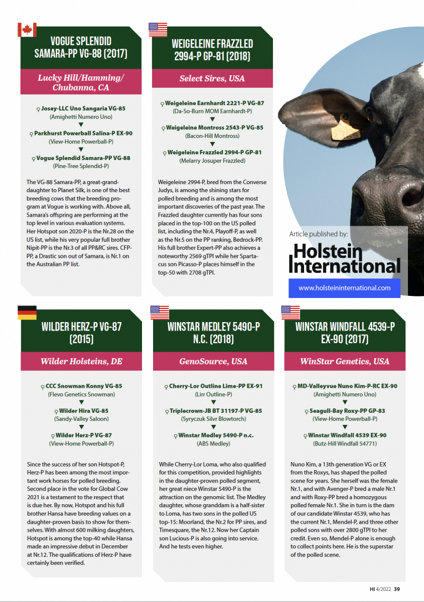 Wilder Herz-P VG-87-DE has been nominated for the Holstein International’s Polled Impact Competition 2022!! Herz P was second in the vote for Global Cow of the Year 2021. Now a days, her sons Wilder Hotspot P and Wilder Hansa P have breeding values on a daughter-proven basis. With almost 600 milking daughters is Hotspot P in the Top 40, while Hansa made an amazing debut in December at the 12th spot. Wilder Herz-P is a Powerball daughter out of Wilder Hira VG-85-DE. She is a Saloon daughter and has already 9 sons in AI. Hira VG-85 her dam is Snowman daughter CCC Snowman Konny VG-85-DE. Another nominee for the Polled Impact Competition 2022 is Calbrett Kingboy Miranda P EX-93-CAN 5yr. 4*, she is the Holstein International’s Cow of the Year 2021! Miranda is the dam to Coombona Zipt Mirand PP *RC @AiTotal & Vogue Redeye P-Red and the grand dam of Illustrator P *RC & Picasso PP *RC!