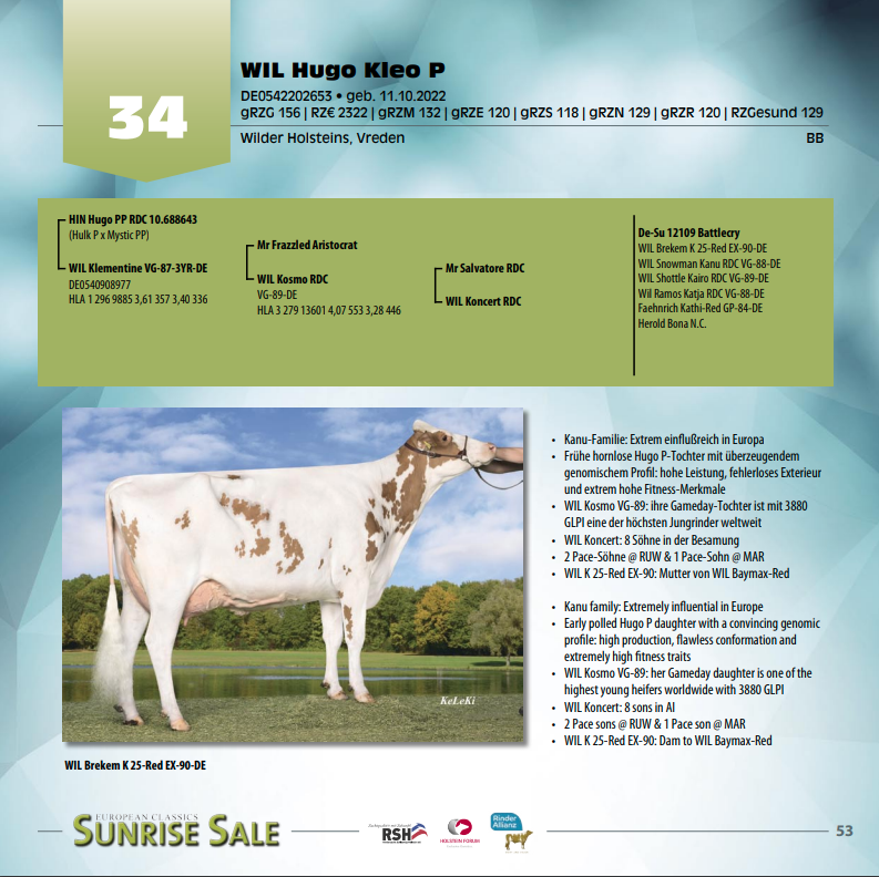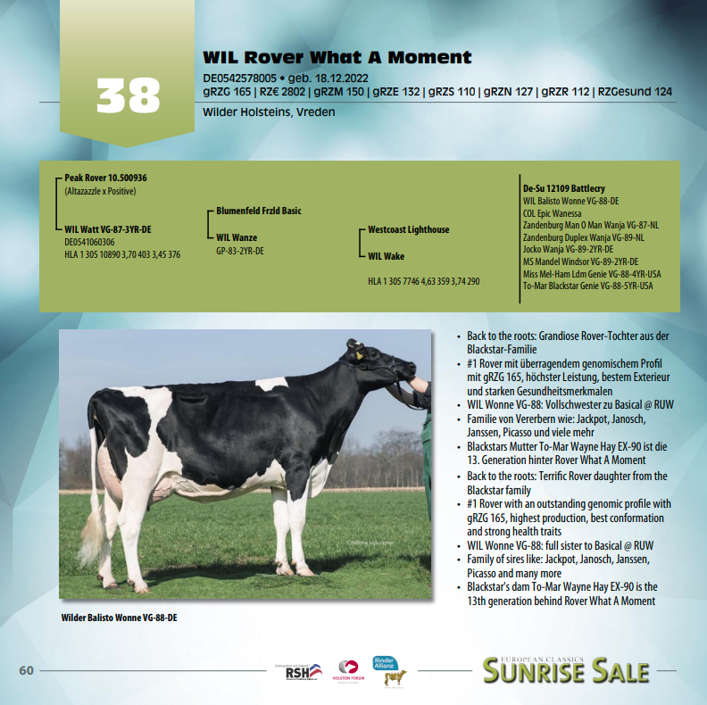 Wilder Holsteins have consigned their greatest index heifers for the Sunrise Sale, Germany March the 24th. Wilder Holsteins has entered 2 heifers with >155 RZG for the sale. They are selling Wil Hugo Kleo P, she is a Hin Hugo PP *RC daughter with no holes in her index: +156 RZG / +120 RZE / +129 RZN and +118 RZS, tracing back to the Wilder K EX-90-DE cow family. Another consignment from Wilder Holsteins is Wil Rover What A Moment! She is the #1 RZG Peak Rover daughter in Europe at +165 RZG from the Jocko Wanja VG-89-DE 2yr. / Blackstar cow family! She combines +165 RZG with +132 RZE and +150 RZM! She is from the same family as Jackpot, Janosch, Janssen, Picasso and Veenhuizer Damion Winnie EX-92-NL, the Grand Champion International show Libramont 2013 and Intermediate Champion & Grand Champion National HHH-Show 2011. Wil Rover What A Moment her 4th dam is Wil Wonne VG-88-DE, she is the full sister to Basical @RUW.