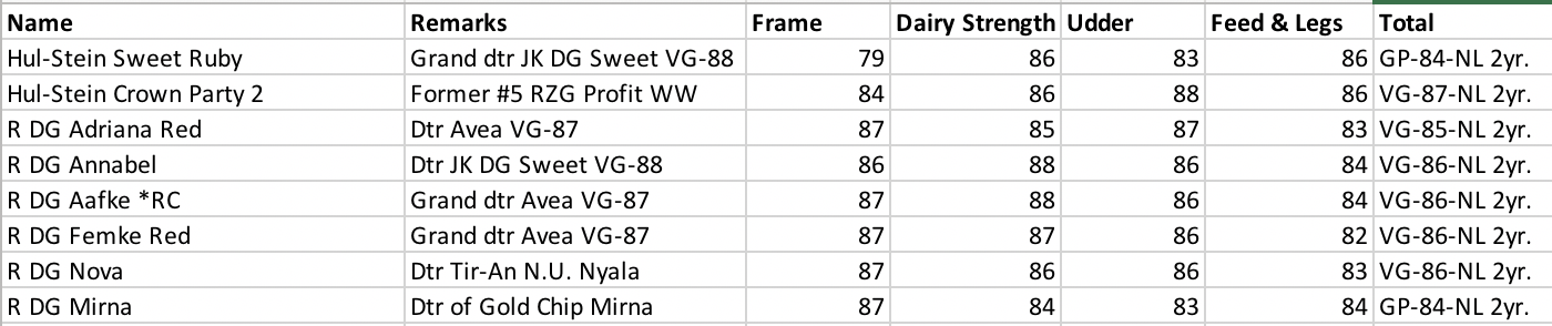 It was a wonderful classifcation day for Rijnhof Holsteins with several Very Good 2yr. Olds! The highlight of the day was Hul-Stein Crown Party 2, she is the former #5 RZG Profit daughter World Wide and comes from the same family as Mr. Sam, Mr. Samuelo, Socrates and many more! She got VG-87-NL 2yr. with and VG-88 Mammary System!
