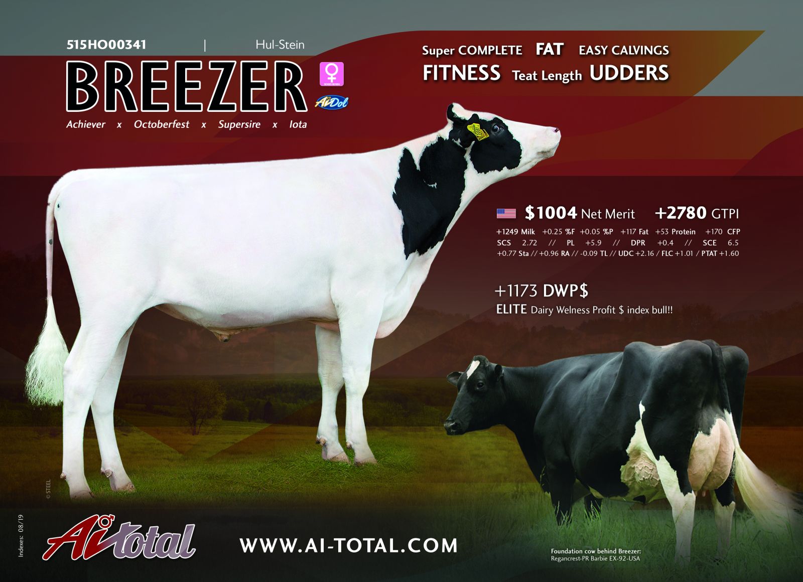 The Achiever son BREEZER, bred by Hul-Stein, already appeared in the global top ranking for GTPI & Net Merit. After the August '19 index run he is as well one of the highest bulls in the breed for the Dairy Welness Profit $ index: DWP$ 1173! The index which calculates the profitability of the genetics based on production and additional fitness traits as mastitis, lameness, metritis, retrained placenta, displaced abomasum and ketosis. As well BREEZER is one of the very few bulls in the world combining >1000 Net Merit, with a positieve DPR, >2 Udder Compisite & >1 for the Feet & Leg index. Breezer goes back on the phenomenal BARBIE cow family and is available through AI Total.