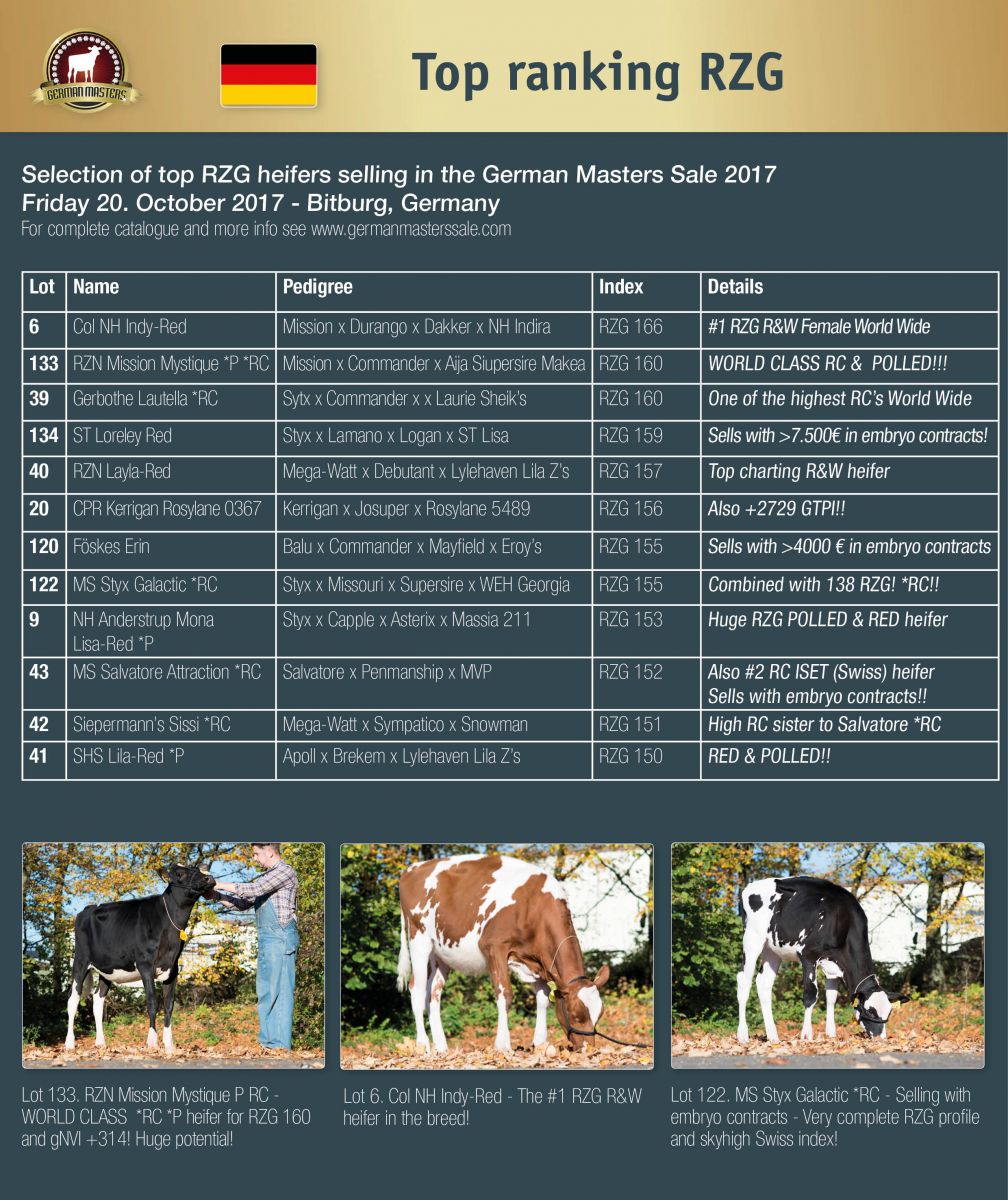 The German Masters Sale 2017 will be held on Friday, the 20. of October 2017, some of the World's highest RZG heifers are selling this edition, including the #1 RZG R&W heifer in the breed (RZG 166), huge RC / POLLED heifer (RZG 160), skyhigh RZG Red Carrier heifer (RZG 160) and more! Click further for a selection of the highest RZG heifers selling in the German Masters Sale 2017! Many of them are selling with lucrative embryo contracts.