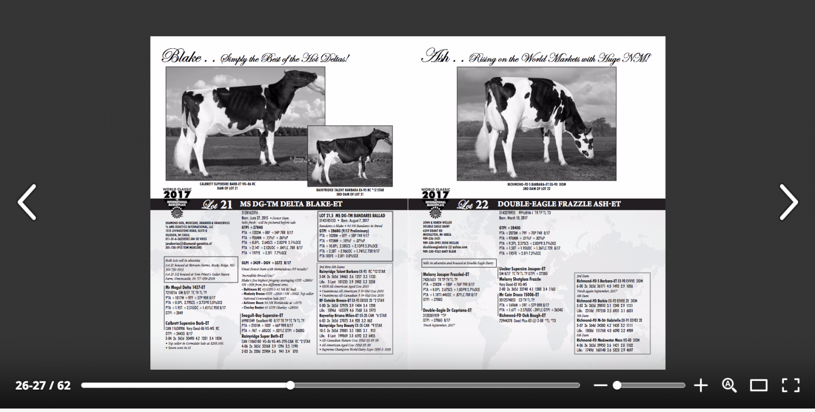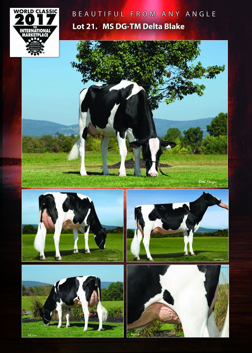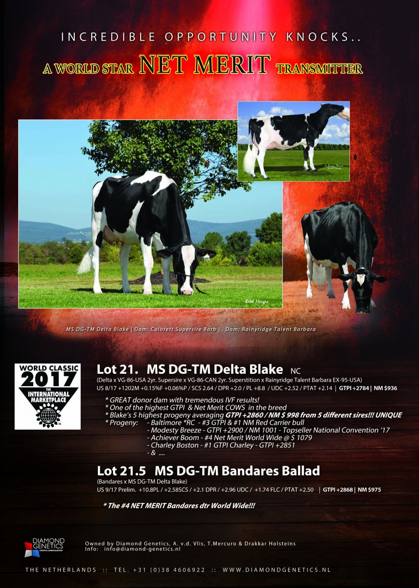 MS DG-TM Delta Blake sells fresh in the World Classic Sale '17 next Friday, the 6th of October 2017 in Madison!! She is one of the highest GTPI & Net Merit cows in the breed and a World Class transmitter, her 5 highest progeny averaging GTPI +2860 / NM $ 997 from 5 different sires and she is a great donor dam with tremendous IVF results! Blake is dam to the #4 NM in the breed (NM $ 1079), to the #1 GTPI Charley in the breed, to the #4 GTPI RC & #1 NM RC bull in the breed and to the Topseller of the Convention Sale '17! Blake sells as Lot 21 and her Bandares dtr as Lot 21.5 (#4 Net Merit Bandares in the breed)! Click further for the newest pictures of BLAKE!!!