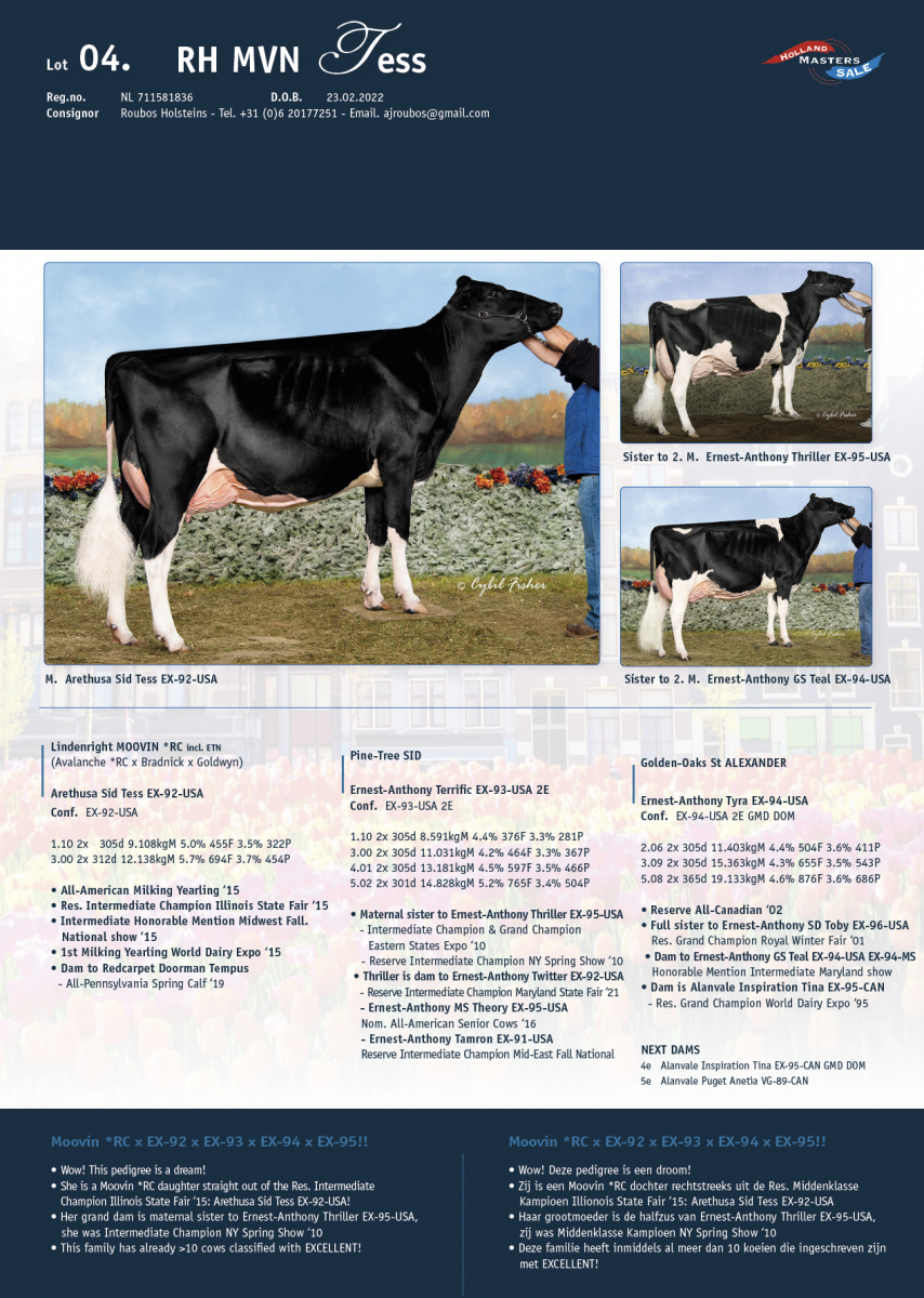 This is your chance on a heifer with a DREAM PEDIGREE! In the Eurogenes Online Embryo Sale this week sells female Woodcrest King Doc embryos straight out of Arethusa Sid Tess EX-92-USA. She is a gorgeous silky black Sid daughter and was Res. Intermediate Champion Illinois State Fair '15 and more! Tess EX-92 is dam to Redcarpet Doorman Tempus, she is the All-Pennsylvania Spring Calf '19. Tess EX-92 her dam is Ernest-Anthony Terrific EX-93-USA 2E (s. Alexander), she is maternal sister to the Intermediate Champion & Grand Champion Eastern States Expo '10 and Res. Int. Champion NY Spring Show '10: Ernest-Anthony Thriller EX-95-USA. These 2 sisters are out of Ernest-Anthony Tyra EX-94-USA, she was Reserve All-Canadian '02 and is full sister to the Res. Grand Champion Royal Winter Fair '01: Ernest-Anthony SD Toby EX-96-USA. In the Online Holland Masters Sale sells this Thursday Tess EX-92 her Moovin *RC daughter as Lot 4!