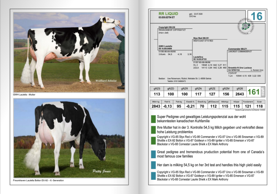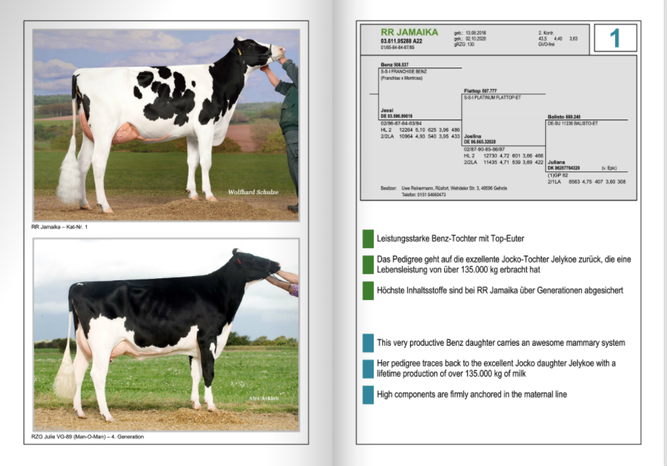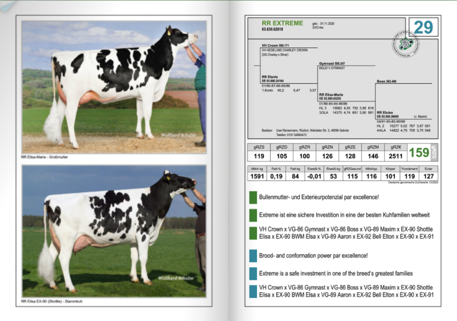 Zuchtbetrieb Reinermann has offered their very best for the OHG Top Genetik Auktion which will take place and start this Friday January 29th at 08:00 A.M. (German time). They are selling a super productive Benz daughter, which is ready for the show ring, bakced by Jocko daughter Jelykoe - >135.000kgM lifetime production as lot 1. As lot 2 another fresh Benz daughter is for sale with 37,9kgM / day from a tremendous US-family backed by Krull Broker Elegance. A super possibillity to invest in the top RZG branch is lot 16. RR Liquid with +161 RZG!! She will be a great investment with +2843 Milk / +156 RZM / +127 RZE from an exciting line: Copyright x VG-85 Styx Red x VG-86 Commander x VG-87 Numero Uno x VG-86 Snowman to Freurehaven Lautella Bolton EX-92-CAN. Another great chance is lot 29. RR Extreme with +159 RZG from a super bull producing family going back on RR Shottle Elisa EX-90-DE. This VH Crown daughter guarantees either for +128 RZE / +146 RZM / +1591 Milk / +0.19%F / +126 RZN and +2511 RZ€.