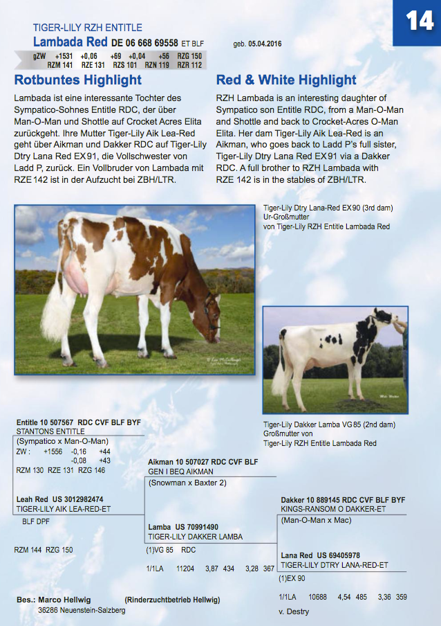 The annual Zukunft Rind Show and Auktion in Hessen, Alsfeld, Germany will be held this Saturday. Rinderzucht Hellwig and Wiesenfeld Holsteins have some great consignments in the sale including: RZH Entitle Lambada, a +150 RZG red Entitle dtr out of the family of Tiger-Lily Ladd P-Red and Wiesenfeld Patsy who is an early Jedi daughter with RZG +154 & +132 Type out of the Holbra Prudence cow family. Click further for more info.